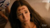 Anežka with "Not Petra" tattoo on forehead